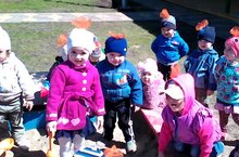11.05.2016 Кечкенәләр төркеме урамда...Калган төркем балалары белән буталмас өчен, тәрбиячеләре балаларның баш киемнәренә ленталар бәйләгәннәр.