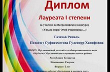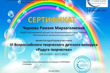 "Радуга творчества" VI Бөтенроссия балалар иҗаты бәйгесендә катнашучы баланың кураторы- тәрбияче Чернова Рәмзия Мирзагали кызы.