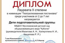 Воспитанники подготовительной к школе группы стали обладателями диплома лауреата II cтепени I Республиканского конкурса "Алиш и детство" среди детей дошкольного и школьного возраста в номинации "Театрализованная постановка" среди участников от 2 до 7 лет. Руководители: Мазитова Айгуль Наиловна, Халиуллина Нафиса Ирхатовна, Кашапова Рамиля Рафитовна.