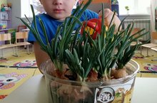 Тәҗрибә үткәрү максатыннан, суган утыртылган бер савытны яктыга, тәрәзә төбенә, а икенчесен караңгы урынга куйдык.