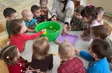 В первой младшей группе провели эксперимент "Тонут - не тонут". Цель эксперимента - подвести малышей к пониманию того, что лёгкие предметы плавают, тяжёлые - тонут. Начали исследовательскую деятельность с лёгких предметов. Раздали детям резиновые игрушки. Опустив их в воду, ребята убедились, что они не тонут и легко можно их выловить с поверхности воды. -