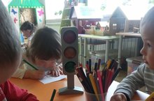 С детьми средней группы повторяли полученные знания о функции светофора и его цветах,навыки поведения на улице.