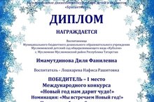 Воспитанники нашего детского сада Имамутдинова Диля, Ханнанова Зайнап, Салимова Язиля приняли участие в международном конкурсе "Новый год нам дарит чудо" и получили дипломы 1 и 2 степени.