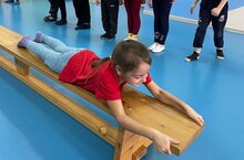 В рамках года родных языков и народного единства дети подготовительной к школе группы на занятии физкультуры повторили ползание на животе и спине по гимнастической скамейке.