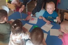 Беренче кечкенәләр төркеме балалары кул белән рәсем ясадылар. Мондый эшчәнлек балаларның уйлау фикерен арттыра, кулларның вак моторикасын үстерә.