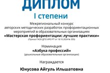 Наши воспитатели Юнусова Айгуль Ильшатовна и Халиуллина Алсу Ильдусовна представили свои работы в межрегиональном конкурсе авторских методических разработок профориентационных мероприятий в образовательных организациях "Мастерская профориентации: лучшие практики" в номинации "Азбука профессий" и заняли первое и второе место!