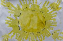 Булачак кояшның нигезе түгәрәк ясалгач, балалар кул эзләрен калдырдылар, һәм искиткеч һәм гадәти булмаган нурлар килеп чыкты. Менә безнең кояш әзер! -