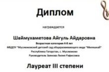 Мәктәпкә әзерлек төркемендә тәрбияләнүче Шәймөхәмәтова Айгөл Бөтендөнья Россия күләм үткәрелгән "Мелодинка" конкурсының вокал-җыр номинациясендә III нче дәрәҗә лауреат исемле Дипломга ия булды. Айгөлнең җитәкчесе бакчаның музыка җитәкчесе Ландыш Заянова .