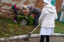 18 октябрь көнне балалар бакчасы участогында өмә ясадык. Балаларның уен мәйданчыкларын яфраклардан арындырдык. Бардер кырларын себердек, корыган чәчәкләрне җыеп алдык.