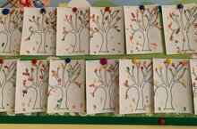 Кечкенәләр төркемендә гадәти булмаган рәсем ясау ысулы белән агачтан яфраклар коелуны кәгазьгә төшерделәр. Бу эшчәнлек аларның ижади кузаллауларын, әйләнә-тирә белән танышырга, төрле төсләрне тоемлауларын, табигатькә карата эстетик карашларын ,кул чукларын ныгытырга үстерергә ярдәм итә.