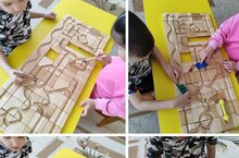 Комплект пластинок из дерева с углублениями используются для составления маршрутов движения. Он состоит из набора фигурок разных расцветок, часть из которых снабжена штырьками, а также шариков для передвижения по «дорожкам». В ходе занятий у ребенка совершенствуется мелкая моторика, он учится простым логическим рассуждениям. Происходит освоение навыка пространственного мышления. Одновременно развивается зрительная координация. -