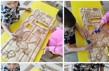 Комплект пластинок из дерева с углублениями используются для составления маршрутов движения. Он состоит из набора фигурок разных расцветок, часть из которых снабжена штырьками, а также шариков для передвижения по «дорожкам». В ходе занятий у ребенка совершенствуется мелкая моторика, он учится простым логическим рассуждениям. Происходит освоение навыка пространственного мышления. Одновременно развивается зрительная координация. -