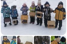 Зурлар төркеме балалары әти-әниләр белән берлектә "Кошларга ярдәм" акциясендә катнашып кышлаучы кошларга җимлекләр ясадылар. Җимлекләргә кошлар туклансын өчен җимнәр салдылар.