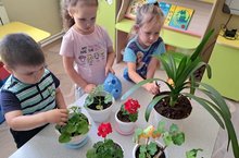 Воспитанники средней группы любят ухаживать за цветами: поливать, рыхлить землю. Им очень интересно наблюдать, как появляются новые листочки, как распускаются бутоны на растениях. А сколько радости и удовольствия доставляет им забота о цветах! -