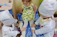 В нашем детском саду дети очень любят играть в сюжетно-ролевые игры. Для игры в эти игры в нашем саду есть все необходимые игрушки. С особой любовью дети играют в сюжетно-ролевую игру "Поликлиника". Они "лечат" игрушечных зверей и кукол. С помощью игрушечных медицинских устройств осматривают "больных", измеряют температуру, делают уколы. Через эту игру дети понимают, что не стоит бояться идти к врачу.