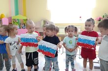 Сегодня в нашем саду отметили День Государственного флага. В связи с этим дети младшей группы ознакомились с Государственным флагом и изготовили флаг методом отрывного склеивания.
