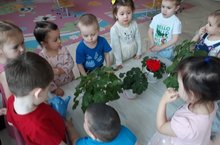 В рамках проекта «Я дитя природы», знакомство с геранью. Цель: расширять представления детей о комнатных растениях: их пользе и строении, учить различать комнатные растения по внешнему виду. Познакомить с правилами полива растения. Поощрять желание ухаживать за комнатными растениями. Воспитывать интерес к исследовательской деятельности, учить размышлять, делать выводы.