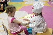 В нашем детском саду дети очень любят играть в сюжетно-ролевые игры. Для игры в эти игры в нашем саду есть все необходимые игрушки. С особой любовью дети играют в сюжетно-ролевую игру "Поликлиника". Они "лечат" игрушечных зверей и кукол. С помощью игрушечных медицинских устройств осматривают "больных", измеряют температуру, делают уколы. Через эту игру дети понимают, что не стоит бояться идти к врачу.