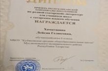 8 нче сыйныф укучысы Хаматшина Л.Г. татар телендә белем бирүче мәктәп укучылары өчен татар әдәбиятыннан республика олимпиадасының призеры булды. Җитәкчесе: Нәҗмиева Г.Л. Котлыйбыз һәм киләчәктә дә уңышлар телибез./Ученица 8 класса Хаматшина Л.Г. стала призером Республиканской олимпиады школьников по родной (татарской) литературе для учащихся школ с татарским языком обучения. Руководитель: Назмиева Г.Л. Поздравляем и желаем дальнейших успехов.