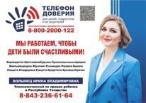 БАЛАЛАР ӨЧЕН ЫШАНЫЧ ТЕЛЕФОНЫ-8-800-2000-122 Кайвакыт сез авыр тормыш ситуациясе белән очраша аласыз, аннан чыгу юлын табу кыен. Гаиләдә яки дуслар арасында ярдәм табу яхшы. Ләкин, кызганычка каршы, кайвакыт сез алар арасында аңлау таба алмыйсыз. Ул вакытта сез үзегезнең балалар өчен ышаныч телефонына шалтыратып, вәзгыятегез турында сөйли аласыз. Ссезне тыңлаячаклар, киңәш яки конкрет гамәлләр белән ярдәм итәчәкләр/ДЕТСКИЙ ТЕЛЕФОН ДОВЕРИЯ - 8-800-2000-122 Дорогие ребята! Иногда вы можете столкнуться с трудной жизненной ситуацией, когда вам сложно найти выход из нее. Хорошо когда вы найдете поддержку в семье или среди друзей. Но, к сожаления, иногда вы не можете найти понимания среди них. Тогда вы можете рассказать о своей ситуации по ДЕТСКОМУ ТЕЛЕФОНУ ДОВЕРИЯ, где вас выслушают, помогут советом или конкретными действиями.