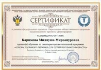 Активно продолжается работа по обучению детей, родителей и педагогов по санитарно-просветительским программам «Основы здорового питания», проводимых в рамках федерального проекта «Укрепление общественного здоровья» национального проекта «Демография». В школе было проведено обучение сотрудников школы, учеников, в ходе которого сотрудники и дети прошли обучение и тестирование, разработанное ФБУН «Новосибирский НИИ гигиены» Роспотребнадзора. Все получили сертификаты об успешном прохождении обучения.