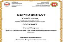Туган телләр һәм халыклар бердәмлеге елы кысаларында, 2021/2022 нче уку елына белем бирү вакыйгалары календаре нигезендә (Россия Федерациясе Мәгариф Министрлыгының 28.05.20021 ел, № ТВ-860/04 хаты) һәм 1941-1945 нче еллардагы Бөек Ватан сугышында Җиңүнең 76 еллыгын бәйрәм итү һәм тарихи хәтерне саклау, укучыларны гражданлык – патриотик рухта тәрбияләү максатыннан, "Билгесез солдат көне"нә багышланган акция үткәрелә. Безнең мәктәп һәм «Юнармия» отряды бу акциягә «Шигырь» (Шәяхмәтова Р., Йосыпова А., Низамова А.), «Тантаналы марш» номинацияләрендә кушылдылар/В рамках Года родных языков и народного единства, в соответствии с Календарем образовательных событий на 2021/2022 учебный год (Письмо Министерства просвещения Российской Федерации от 28.05.2021 № ТВ-860/04) и в целях сохранения исторической памяти и ознаменования 76-летия Победы в Великой Отечественной войне 1941 – 1945 годов, гражданско-патриотического воспитания обучающихся проводится акция, посвященная Дню неизвестного солдата. Обучающиеся нашей школы и отряд «Юнармия» подключились к этой акции в номинациях «Стихотворение» (Шаяхметова Р., Юсупова А., Низамова А.), «Торжественный марш».