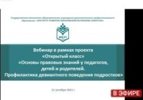 «Балалар һәм ата-аналарда хокукый белемнәр нигезләре. Яшүсмерләрнең девиант тәртибен профилактикалау" темасына вебинар/Вебинар «Основы правовых знаний у педагогов детей и родителей. Профилактика девиантного поведения подростков» 21.10.2021