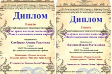 "Көмеш нота" түгәрәгендә шөгыльләнүче укучыларыбыз Сәхбиева Әминә һәм Валеева Язилә “Минем халкымның мәдәни мирасы" Республикакүләм ижади бәйгесенең "Милли моннар" номинациясендә 1 нче дәрәҗә дипломга лаек булдылар.