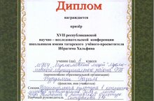 Ибраһим Хәлфин истәлегенә багышланган республикакүләм фәнни-тикшеренү конференциясендә 8б сыйныфы укучысы Нуруллин Рәзил призлы урынга лаек булды