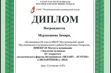 Ученица 6б класса Мурзаханова Замира- призёр (2 место) в номинации "Экология человека" XV открытого экологического форума обучающихся "Зилант- Juvenis" ("Зилантенок- 2024"). Руководитель- Султанова А.И. Поздравляем!