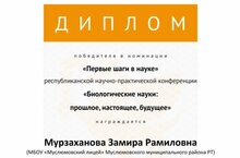 Ученица 6б класса Мурзаханова Замира стала победителем в номинации "Первые шаги в науку" республиканской научно-практической конференции "Биологические науки: прошлое, настоящее, будущее". Руководитель: Султанова А.И.