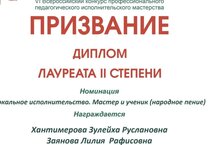 На VI Всероссийском конкурсе профессионального педагогического исполнительского мастерства "Призвание", организованном Министерством культуры Российской Федерации, Министерством культуры Республики Татарстан, ФГБОУ ВО «Казанский государственный институт культуры» ученица 9 класса Муслюмовского лицея Хантимерова Зулейха и её руководитель Заянова Лилия Рафисовна награждены Дипломом Лауреата 2 степени в номинации “Мастер и ученик” за исполнение татарской народной песни.