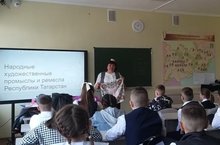 С целью создания у детей представления о многообразии существующих видов народных промыслов на территории Республики Татарстан, воспитания нравственно-эстетического отношения к миру, чувства патриотизма, в 5а классе пошел классный час "Народные промыслы народов Республики Татарстан". Учащиеся познакомились с понятиями «ремесло», «промысел». Узнали о многообразии форм художественного творчества: роспись и резьба по дереву, вышивка, кружево, изделия из глины, кожи, металла.