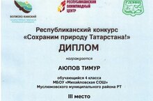 Ученик 4 класс Аюпов Тимур принял участие в республиканском конкурсе "Сохраним природу Татарстана!" и занял III место в номинации "Социальный плакат" среди школьников младшей возрастной группы.