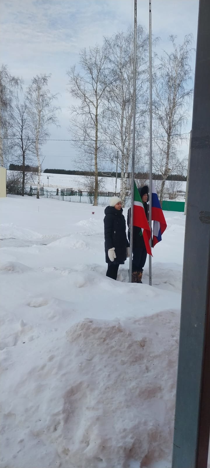 В рамках патриотического воспитания еженедельное поднятие флагов и исполнение гимнов РФ и РТ по Стандарту церемонии поднятия (спуска) Минпросвещения России. 18.12.2023