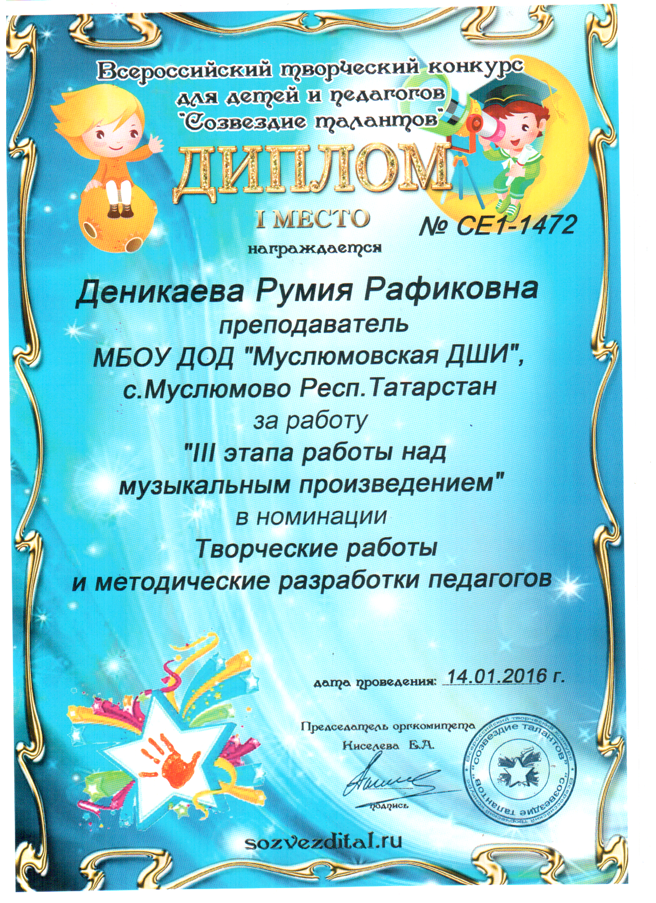 Сафиуллина Раиса Расиховна. Диплом Всероссийского творческого конкурса "Рассударики" от 31.03.2016