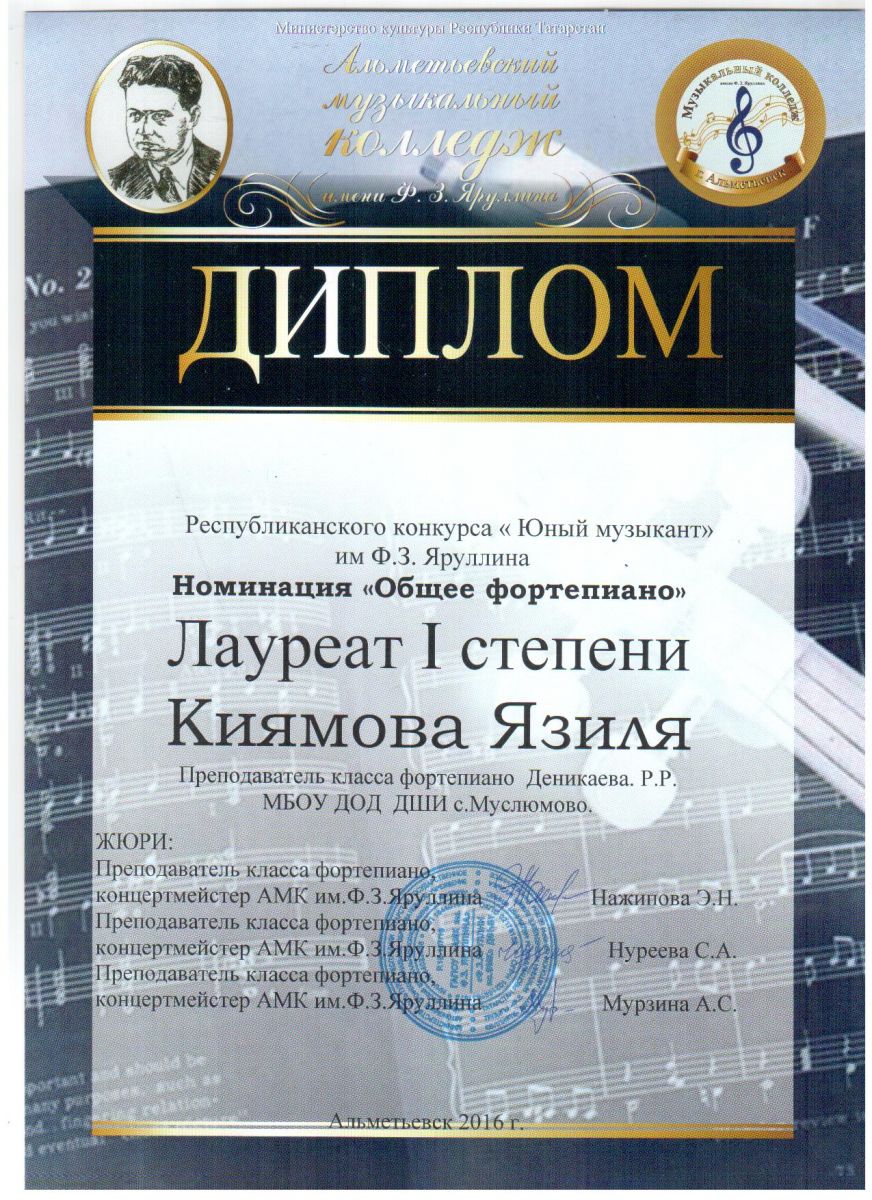 Киямова Язиля. Диплом лауреата I степени Республиканского конкурса "Юный музыкант" им. Ф.З. Яруллина