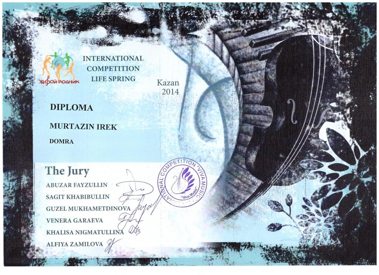 Муртазин Ирек. Диплом V Международного конкурс-фестиваля народного творчества «Живой Родник».