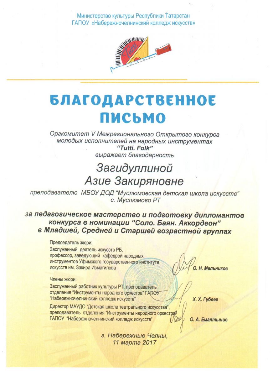 Загидуллина Азия Закиряновна. Благодарственное письмо оргкомитета  III  Межрегионального Открытого конкурса молодых исполнителей на народных инструментах "Tutti.