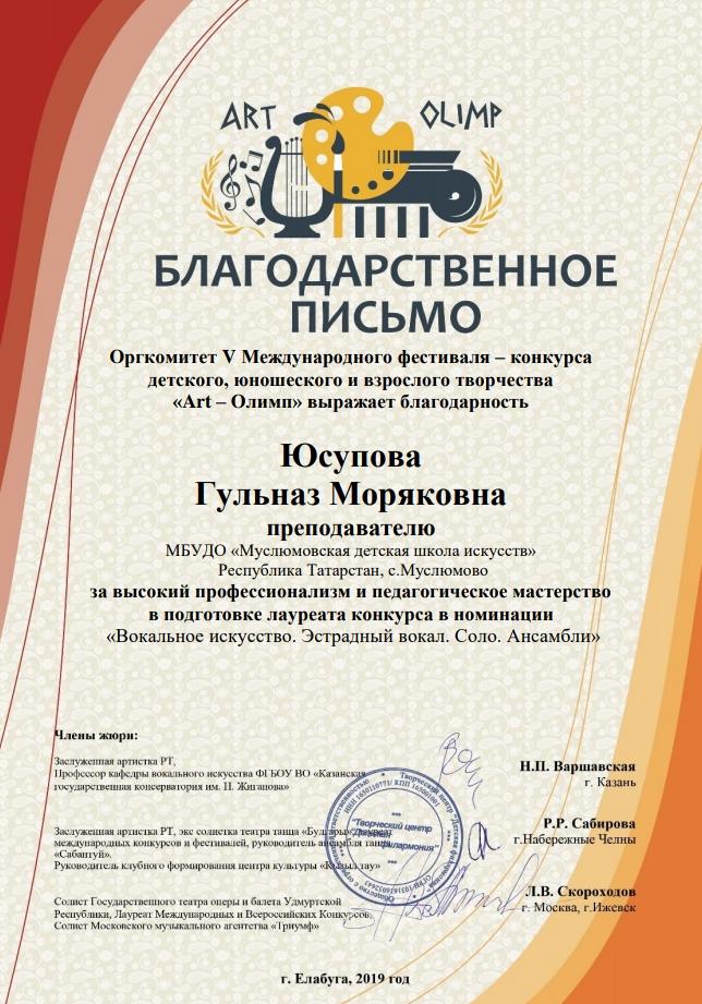 Благодарственное письмо Юсуповой Гульназ Моряковне за высокий профессионализм и педагогическое мастерство в подготовке лауреата конкурса в номинации " Вокальное искусство. Эстрадный вокал. Соло. Ансамбли".