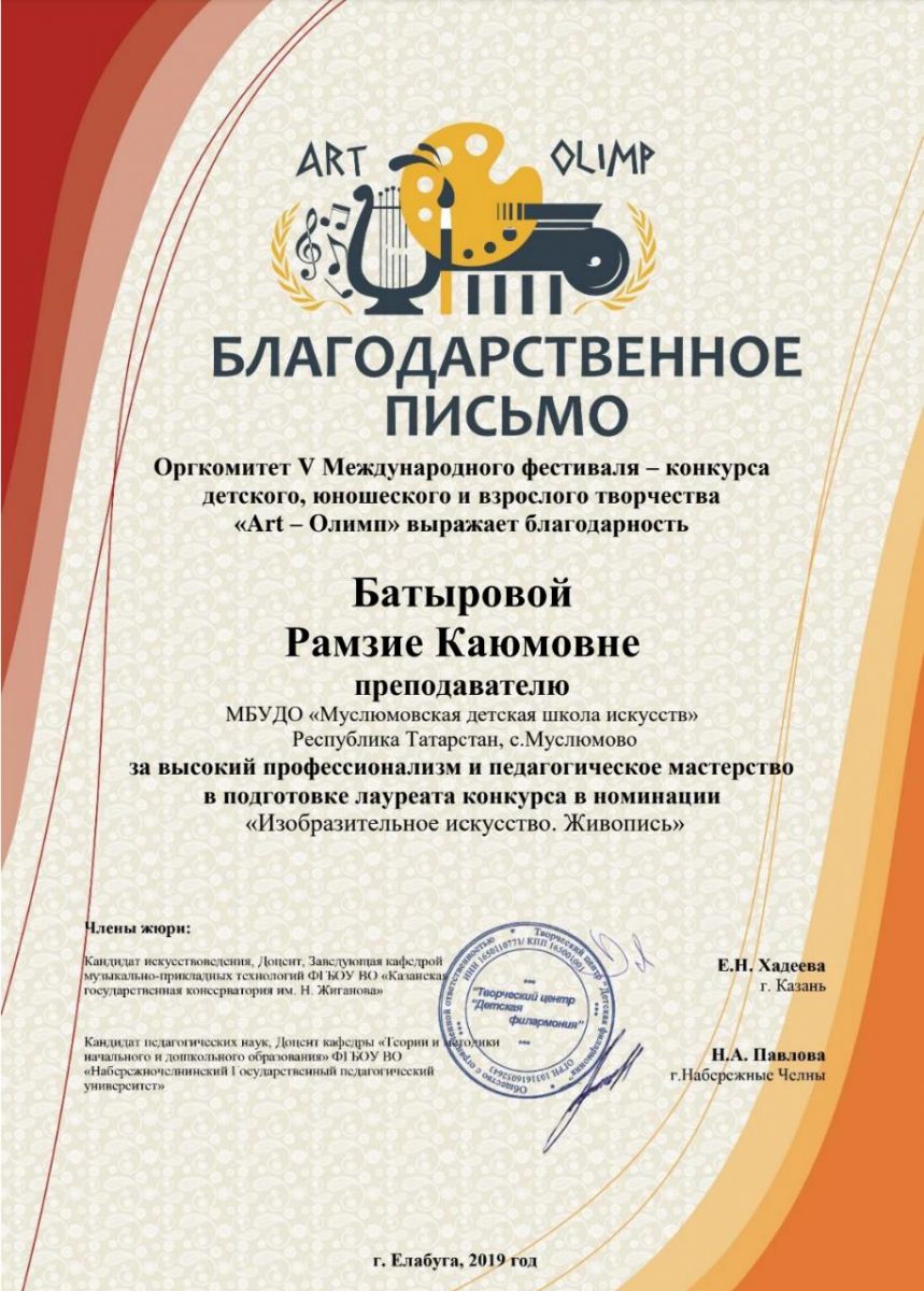 Благодарственное письмо Батыровой Рамзие Каюмовне за высокий профессионализм и педагогическое мастерство в подготовке лауреата конкурса в номинации "Изобразительное искусство. Живопись."