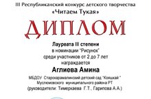 "Тукайны укыйбыз" дип исемләнгән III Республикакүләм балалар иҗаты конкурсында катнашып "Рәсем" номинациясендә Аглиева Әминә