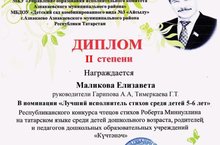 Мәктәпкәчә яшьтәге балалар, ата-аналар, тәрбиячеләр арасында үткәрелгән Роберт Миңнуллин шигырьләрен уку республикакүләм конкурсында "5-6 яшьлекләр арасында иң яхшы шигырь укучы" номинациясендә Маликова Елизавета II дәрәҗә дипломга ия булды.