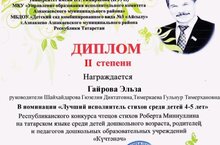 Мәктәпкәчә яшьтәге балалар, тәрбиячеләр, ата-аналар арасында уздырылган Роберт Миңнуллин шигырьләрен уку республикакүләм конкурсында катнашып, "4-5 яшьлекләр арасында иң яхшы шигырь укучы" номинациясендә Гайрова Эльза II дәрәҗә дипломга ия булды.