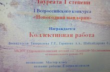 Тәрбиячеләр : Гарипова А.А., Тимеркаева Г.Т., Шайхайдарова Г.Д., Яңа елга багышланган IБөтенрәсәй "Яңа ел мандарины"исемле конкурсында катнашып ,мастер-класс номинациясендә 1 дәрәҗә дипломга ия булдылар