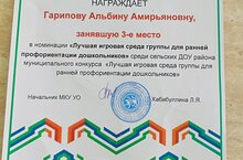Тәрбияче, Гарипова Альбина " Мәктәпкәчә яшьтәге балалар өчен иң яхшы уен мохите" дип аталган муниципаль конкурста катнашып, 3 урын алды.