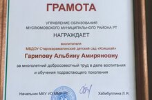 Мәгариф хезмәткәрләренең август киңәшмәсендә тәрбияче Гарипова Альбина балаларны укыту һәм тәрбия эшендә күпьеллык намуслы хезмәте өчен Мөслим муниципаль районы мәгариф бүлегенең Мактау грамотасына ия булды.
