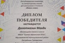 2нче сыйныф укучысы Долотказин Махди "Живое слово" исемле әдәби уку буенча республикакүләм олимпиадада җинеп чыкты. Җитәкчесе - Гараева Р.М.