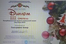 3нче сыйныф укучысы Гизтдинов Л.Ф. республикакүләм "Эко-Чыршы-2023" акциясендә "Ел символы-2023" номинациясендә 3 дәрәҗә дипломга лаек булды. Җитәкчесе-Мукминова Ч.М.