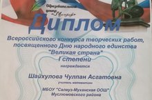 Укытучыбыз Шайхулова Ч.А. Халыклар бердәмлеге көненә багышланган рәсәйкүләм иҗади эшләр конкурсында 1 дәрәҗә дипломга лаек булды.